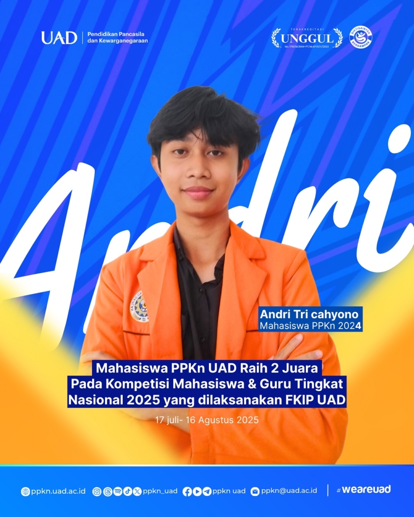 Yogyakarta – Program Studi Pendidikan Pancasila dan Kewarganegaraan (PPKn) Universitas Ahmad Dahlan (UAD) kembali menorehkan kebanggaan di kancah kompetisi nasional. Mahasiswa berprestasi PPKn UAD angkatan 2024, Andri Tri Cahyono, berhasil meraih dua gelar juara sekaligus dalam Kompetisi Mahasiswa dan Guru Tingkat Nasional 2025.